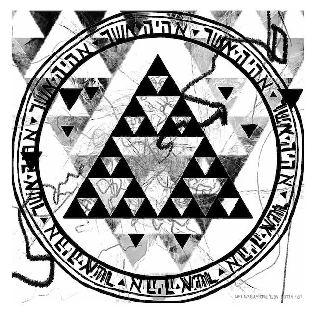 This shiviti includes the triangular element called the Sierpinski Fractal, a geometrical formula that is both infinitely scaleable and reducible, while revealing the exact geometrical expression throughout. This visual object appeared to me while meditating with the support of a plant medicine, and upon research I found it was articulated in 1915 by Wacław Franciszek Sierpiński, a Polish mathematician.